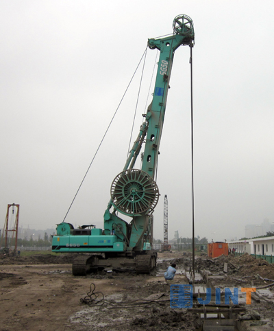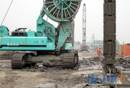 該工地基坑設計深度25米,連續墻寬度1米、深度40~50米。由于地層復雜,50米以上粘土層、細沙層、卵石層交錯,承壓水深,臨近地鐵要求施工震動小等因素,給施工帶來不小困難。施工單位華東建設基礎工程有限公司,引進我公司SG35、SG40A、SG50等5臺液壓連續墻抓斗和其他廠家兩臺設備,憑著優越的性能、良好的可靠性和出色的效率,金泰抓斗以每臺每天開挖200~250方的速度,晝夜奮戰工地前線,按時完成施工任務,得到施工單位的充分肯定,形成鮮明對比的是工地上其他廠家的抓斗施工效率僅為金泰抓斗的三分之二。