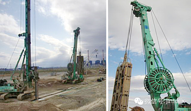 位于哈密伊吾縣淖毛湖鎮境內的新疆廣匯能源有限公司120萬噸甲醛/80萬噸二甲醚項目占地面積為100公頃,總投資額近70億元,是新疆“十二五”期間重點投資項目。該項目配套設施之一的地下水污染防治工程防滲處理采用的是地下連續墻施工工藝。資料顯示,防滲墻墻體總長超過3200米,成槽開挖土方近14萬立方米,地連墻槽寬0.8米,槽深19.5-34.5米不等,地層以砂層、卵石層和砂巖層為主。由于地質結構較為復雜,巖層、卵石分布不均,在硬巖地層單以抓斗取土成槽無法滿足施工進度。為此,施工方采用SD/SH旋挖鉆進引孔,隨后在一般地層以SG抓斗取土直接成槽、如遇較硬砂巖則以DX800單論銑槽機對巖層進行銑削、氣舉排渣成槽的組合工法施工。