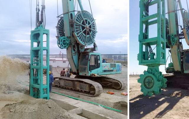 哈密是新疆維吾爾自治區的“東大門”,素有“西域咽喉,東西孔道”之稱,也是國家“一帶一路”西進戰略的重要節點。日前,八臺SG地連墻抓斗、三臺DX單輪銑槽機、二臺SD/SH多功能鉆機組成的上海金泰樁工機械“戰隊”現身新疆哈密淖毛湖地區,為新疆廣匯能源有限公司120萬噸甲醛/80萬噸二甲醚項目的配套工程——地下水污染防治項目助戰立威。上海金泰的SG抓斗、SD/SH多功能鉆機等主流產品與最新研制的“定制化”產品——DX800單論銑槽機同臺競技、默契配合,再次譜寫金泰多系列裝備的協同工藝發揮威力的經典案例。